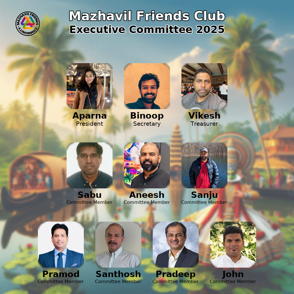 Mazhavil Friends Club is led by a core Committee which is a team of founder members. For each program, Mazhavil Friends Club forms an organizing committee to oversee the program planning and execution.